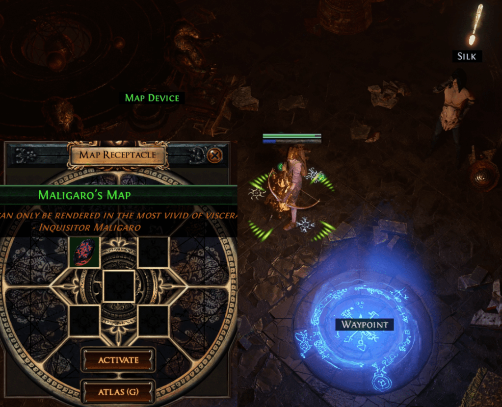 4) Proceed towards Chamber of Sins Level 1. In it, we need to get to the middle of the zone, where waypoint, Silk & map device are. Currently, talking with Silk does nothing, but when you interact with the map device, the new window will open (with 4 cubes, not 5 like in the image, we unlock fifth place for map device later in the end-game!) and you need to put “Maligaro’s Map” in it.