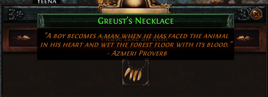 Helena gives a pair of 4 linked boots (Very good!) and she gives us a quest item “Greust’s necklace” that we need to place on a certain shrine.