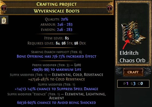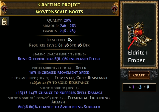 - Once you’re done with Step 8, you will need some Eldritch Embers and Ichors to get modifiers that you need for the boots in order to finish it.