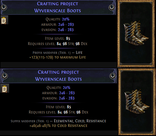 - We can start with either Life or Elemental Resistance fractured mod. Whichever way you go, both boots got the same/similar outcome.