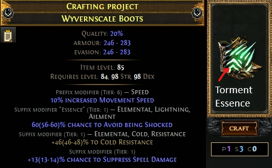 - We are looking for “Deafening Essence of Torment” which give us “Chance to avoid being Shocked” modifier as a suffix on boots. (It also gives the same modifier on other armour, but generally it is best used on boots)