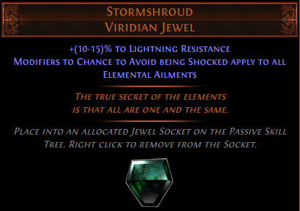 Stormshroud is a jewel that allows us to change “Chance to avoid Being Shocked” to “Chance to Avoid all Elemental Ailments”