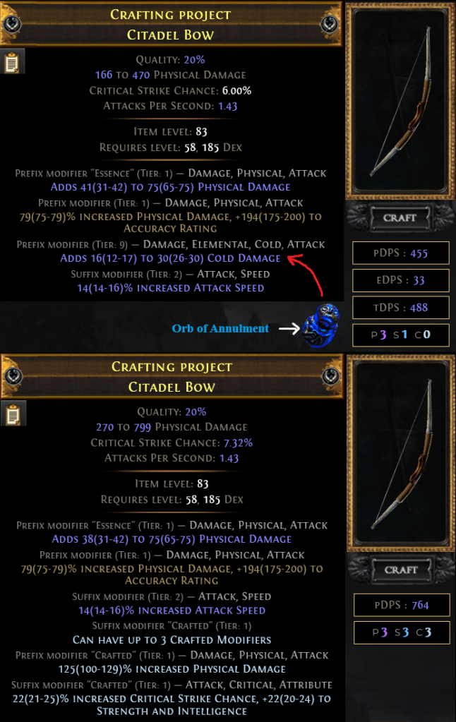 SUFFIX: If you get Attack Speed mod, then you will need to use the Orb of Annulment to remove other mods; - Once you finish with step 4, bow should have 3 modifiers, which are either: